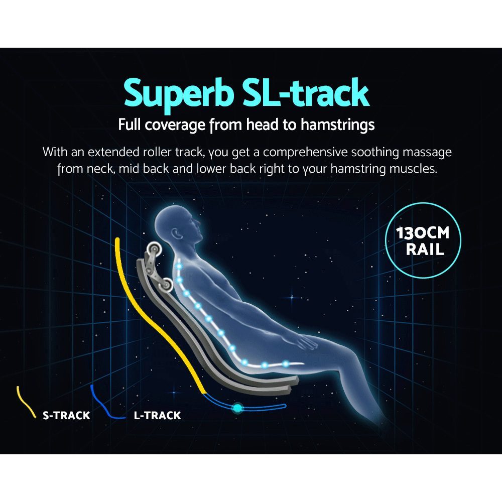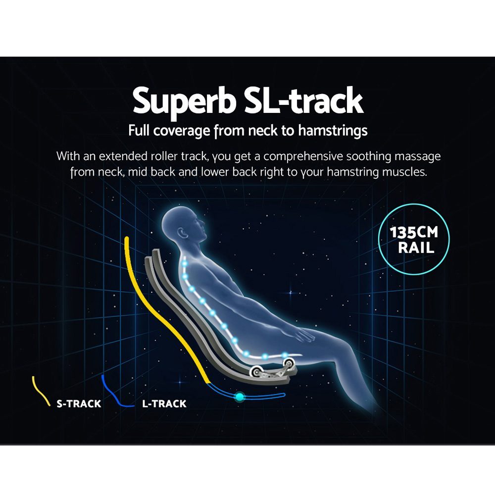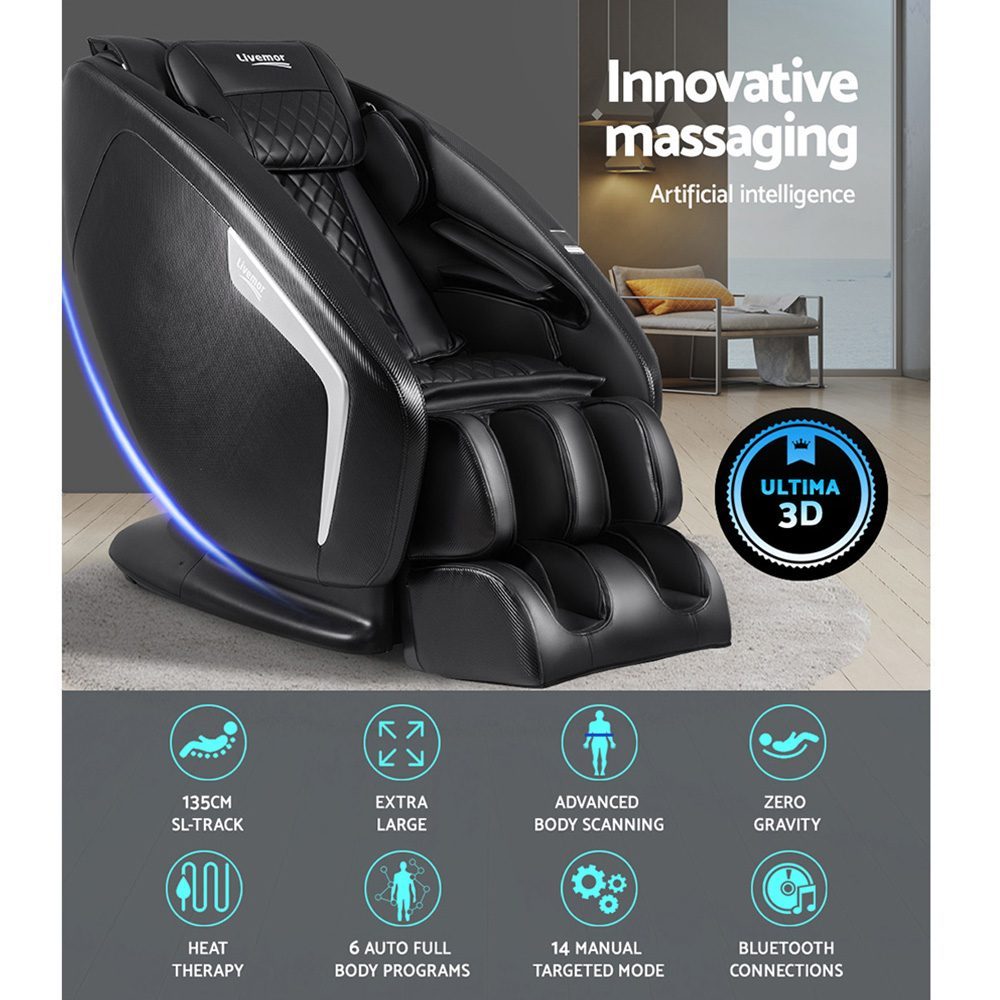 Incorporating the latest smart massage technology and enhanced spatial comfort, our Livemor Ultima 3D Electric Massage Chair is designed to deliver a truly exceptional deep tissue massage experience synonymous with the human touch and more. Among its many technological advancement is an extended 135cm SL track that provides full body massage coverage from your head right to your hamstring muscles. The 3D roller track actually follows the curvature of your spine and extends beyond to your thighs to ensure that all part of your body is not amiss with its soothing massages. Better still, the massage chair also has an automatic body scanning function that maps out the key areas of neck and back for a consistent massage. With a fascinating array of full body massage programs and complex massage techniques with even more airbags, you are certainly not lacking in choice. Adjustments can also be made for massage intensity and speed as well as width. Not least, you can get to enjoy your zero-gravity massage with your favourite music or eBook via a convenient bluetooth connection.