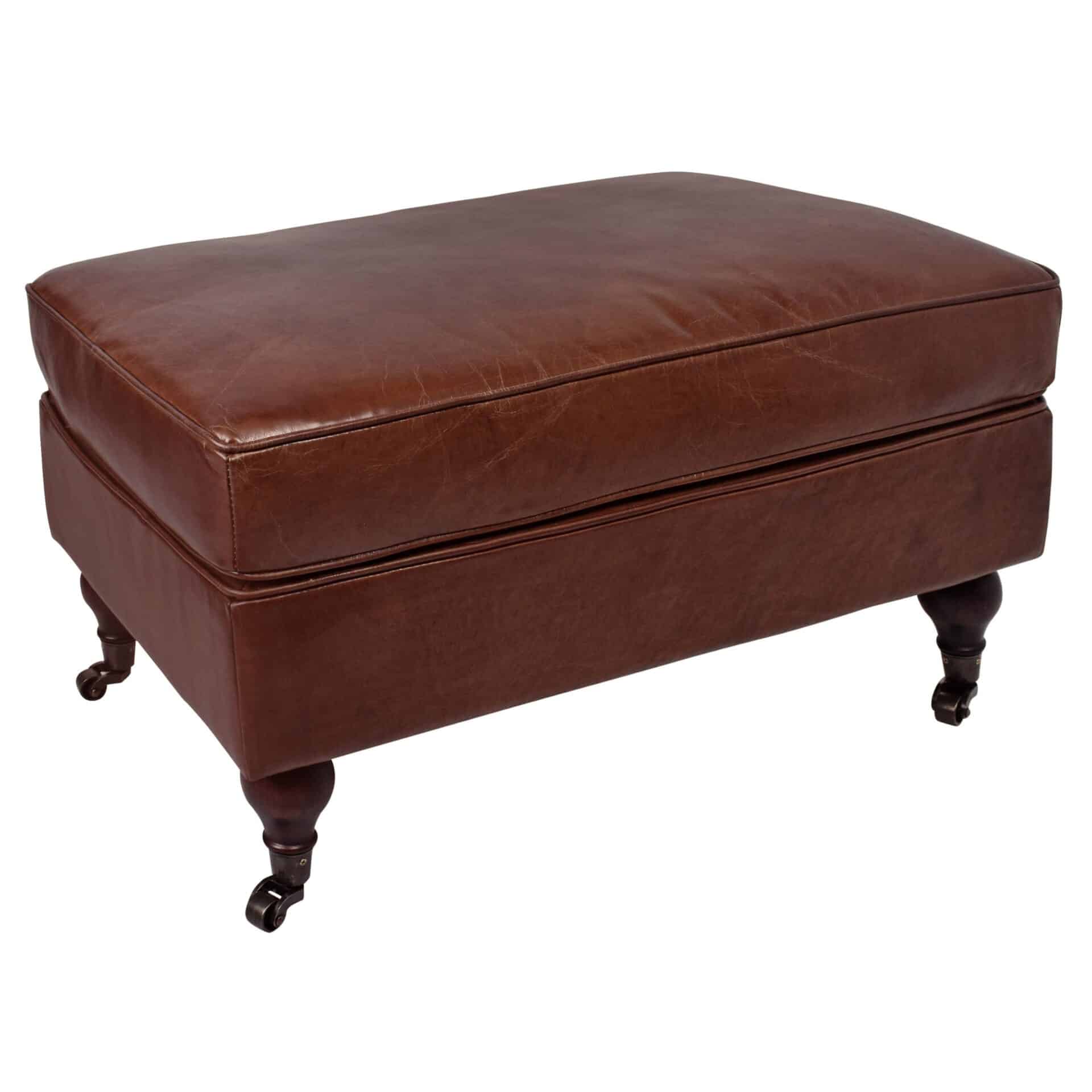 Hand-aged leather that tells a story. The Whitehall Club Ottoman sits on antique castor wheels for easy repositioning and features a high-density foam-feather cushion that never loses its shape.